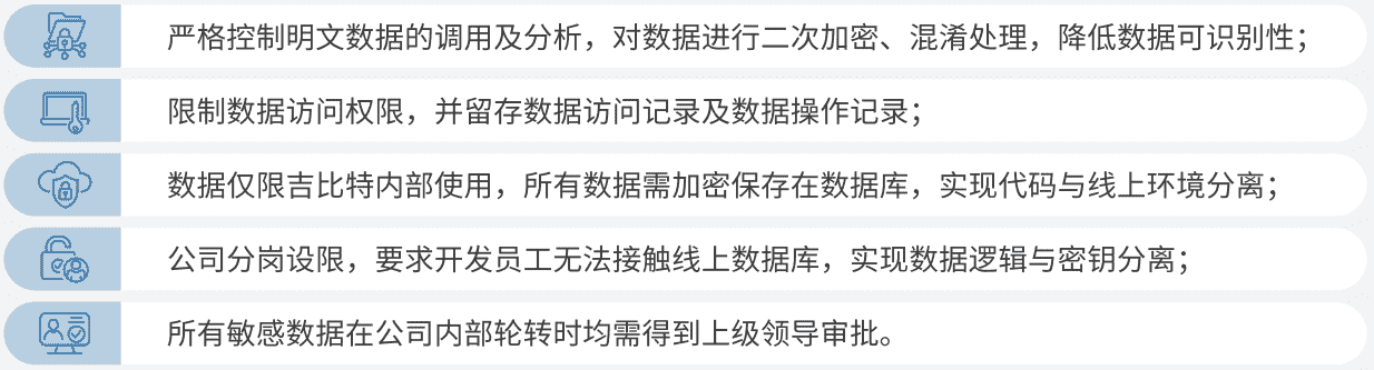 公司對用戶個人信息實施脫敏處理,,嚴格限制用戶信息用途,,,,數據使用完成后集中歸檔處理。。。。為進一步確保數據處理過程的安全,,,公司根據實際的業務工作分崗設限,,,,最大程度保護數據隱私安全,,如在生產網絡中的加密數據由研發部門員工負責編寫加、、、、解密程序,,,但其無法直接訪問到加密后的數據庫;程序的加、、、、解密密鑰由運維員工單獨配置。。