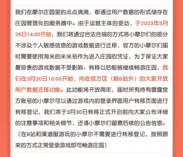2023年3月24日,,,雷霆游戲和淘米游戲同時(shí)官宣::由于淘米游戲授權(quán)雷霆游戲發(fā)行的《摩爾莊園》手游項(xiàng)目合約即將到期、、、淘米對(duì)摩爾莊園的IP發(fā)展和游戲運(yùn)營(yíng)有進(jìn)一步的規(guī)劃,,,,經(jīng)過(guò)雙方充分友好的溝通,,,,決定在合約到期后結(jié)束合作,,,《摩爾莊園》手游將在2023年5月26日起移交淘米游戲發(fā)行運(yùn)營(yíng)。。。