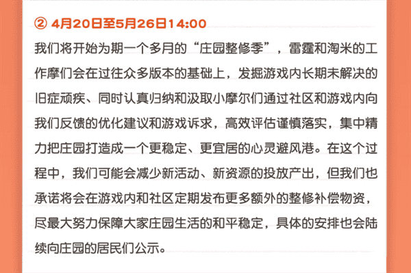 合作的結(jié)束并不意味著這個(gè)童年IP的結(jié)束,,,對(duì)于《摩爾莊園》手游而言,,,這是一個(gè)新階段的開(kāi)始。。。后續(xù)游戲內(nèi)將開(kāi)啟莊園重構(gòu)計(jì)劃,,會(huì)就以往遺留下來(lái)的BUG進(jìn)行集中修復(fù),,,,并在游戲內(nèi)和社區(qū)定期發(fā)布更多補(bǔ)償物資。。。