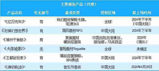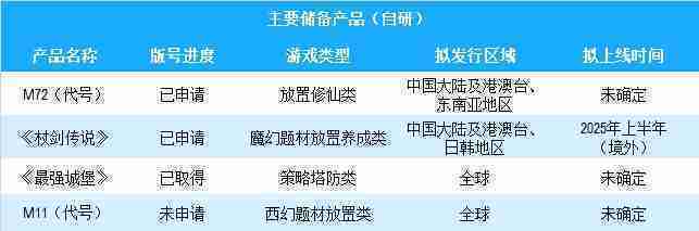 公司有多款儲備產(chǎn)品,,涵蓋放置類、、、、策略類、、、RPG、、Roguelike等多元化游戲品類,,儲備的主要自研和代理產(chǎn)品如下:::