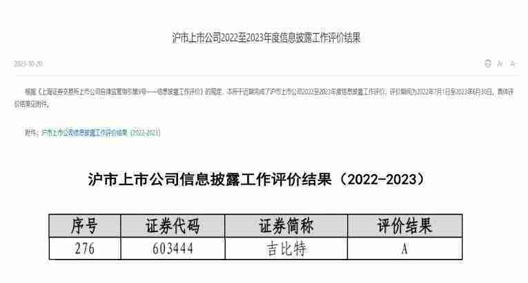 近日,,上海證券交易所發布2022-2023年度信息披露工作評價結果。。35273(股票代碼::::603444)憑借規范的公司治理、、、、高質量的信息披露以及良好的投資者關系管理再次榮獲信息披露工作A級評價,,,公司連續兩年獲此殊榮。。。。